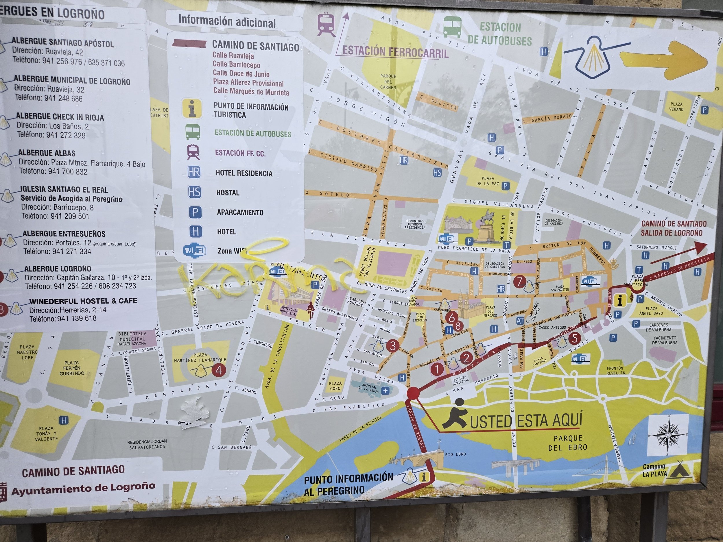 I went back out into the rain with my next goal to find a pharmacy. Before I’d left for Spain, fellow Orlando pilgrims recommended I buy ibuprofen topical gel for muscle aches and pains. With recent store closures due to holidays, I hadn’t had a chance to find any yet. After making my purchase, I found the correct bus stop on my map of Logroño and waited.