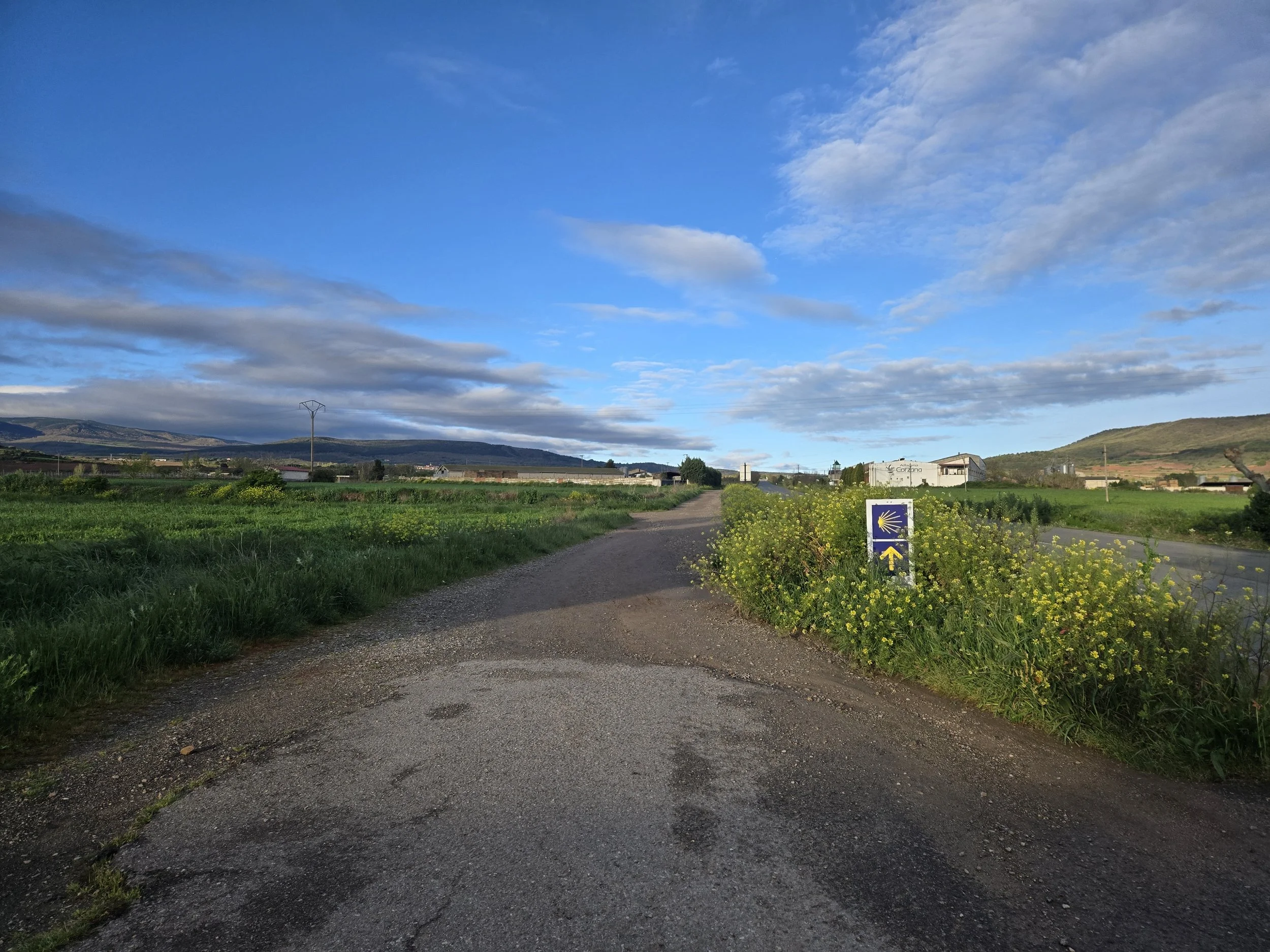 When I woke up, I was happy to see that the blister threading had worked to drain all the fluid out. I carefully removed the thread and put a new Compeed on then padded it with hiker’s wool. I left around 7:50am, the morning was a bit cold but luckily no rain today. The beginning section was a nice, flat walk across farmland, then along a highway.