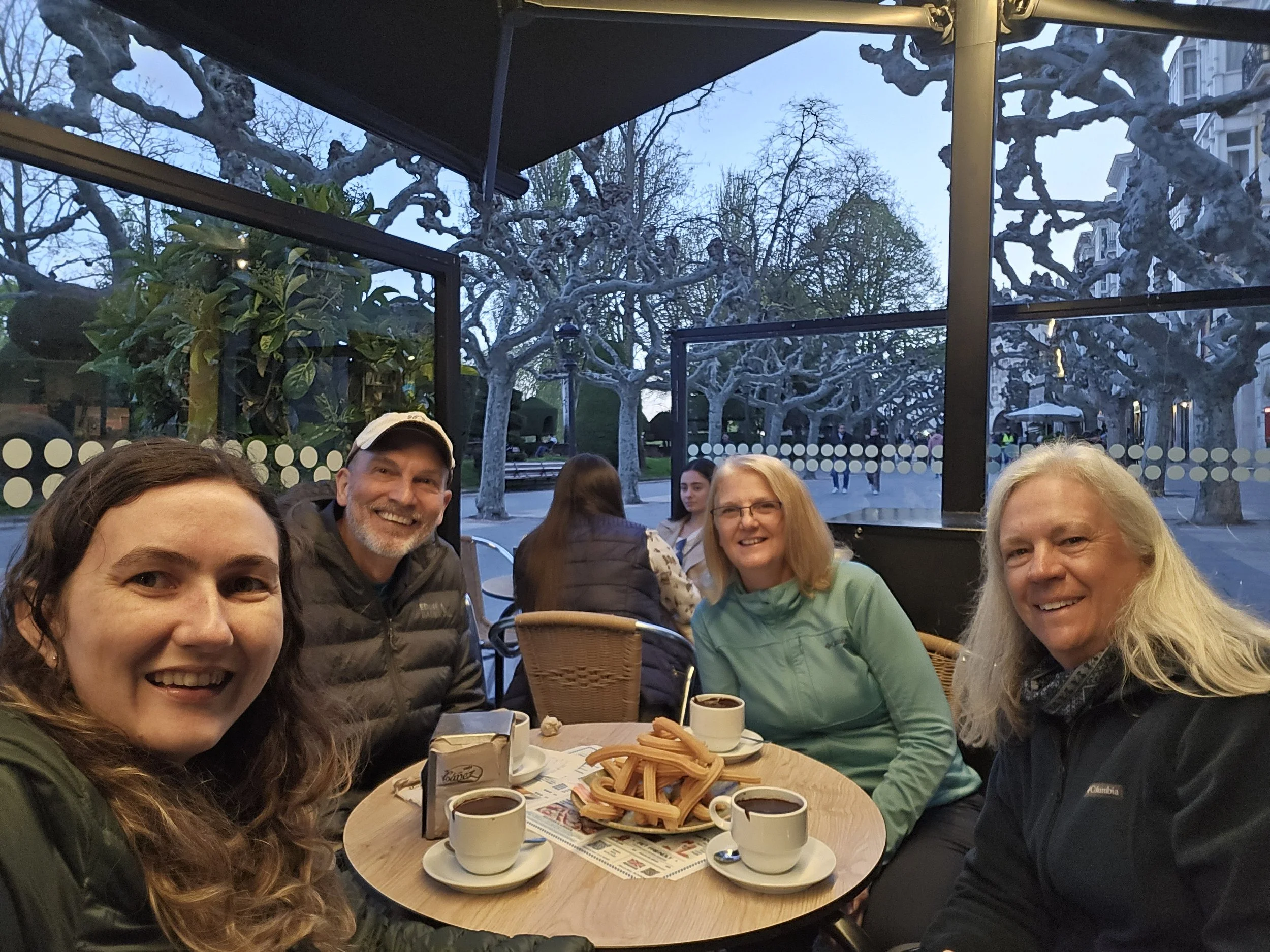 (L to R) me, Bill, Cathy, and Sue eating churros dipped in thick chocolate sauce