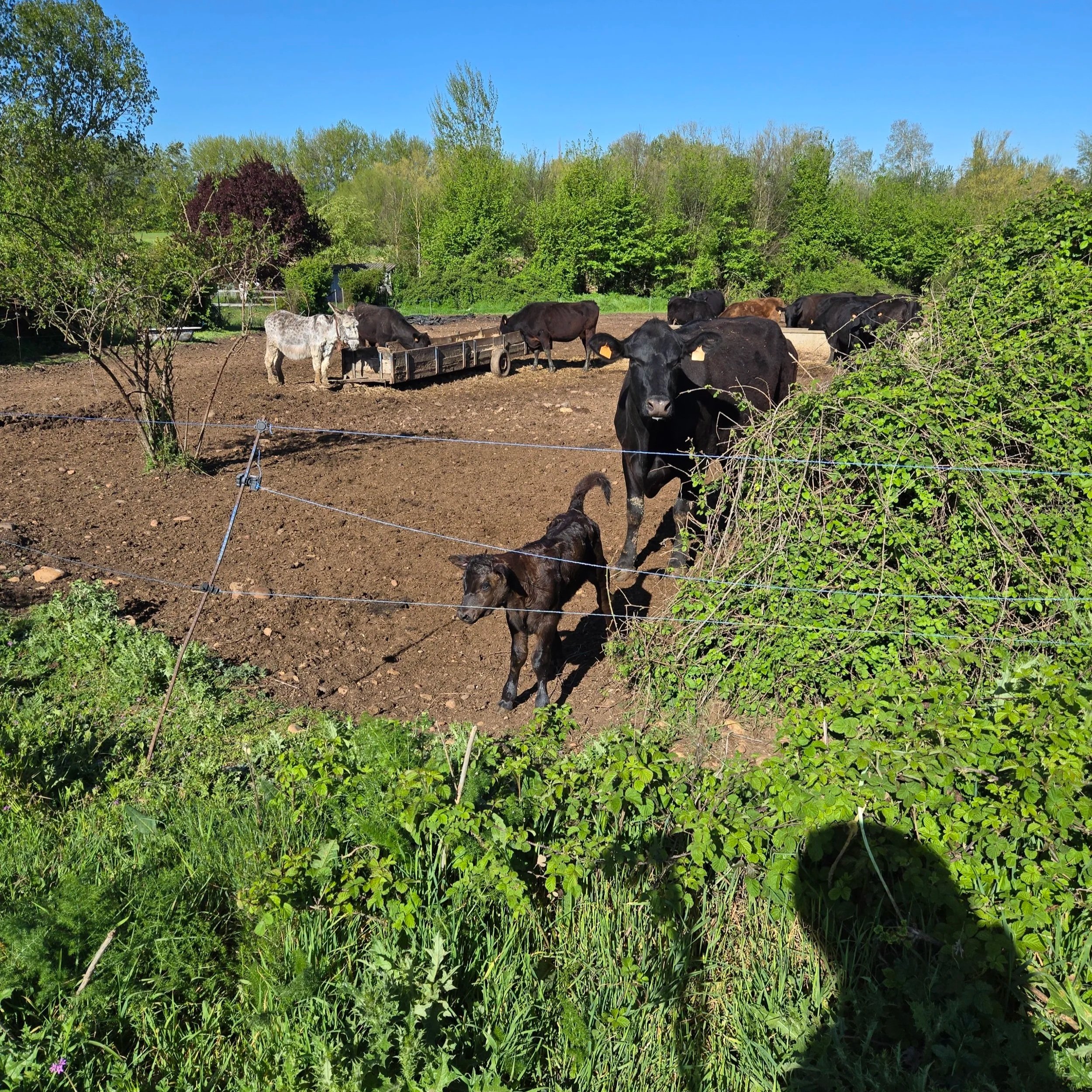 Curious calf, protective mom
