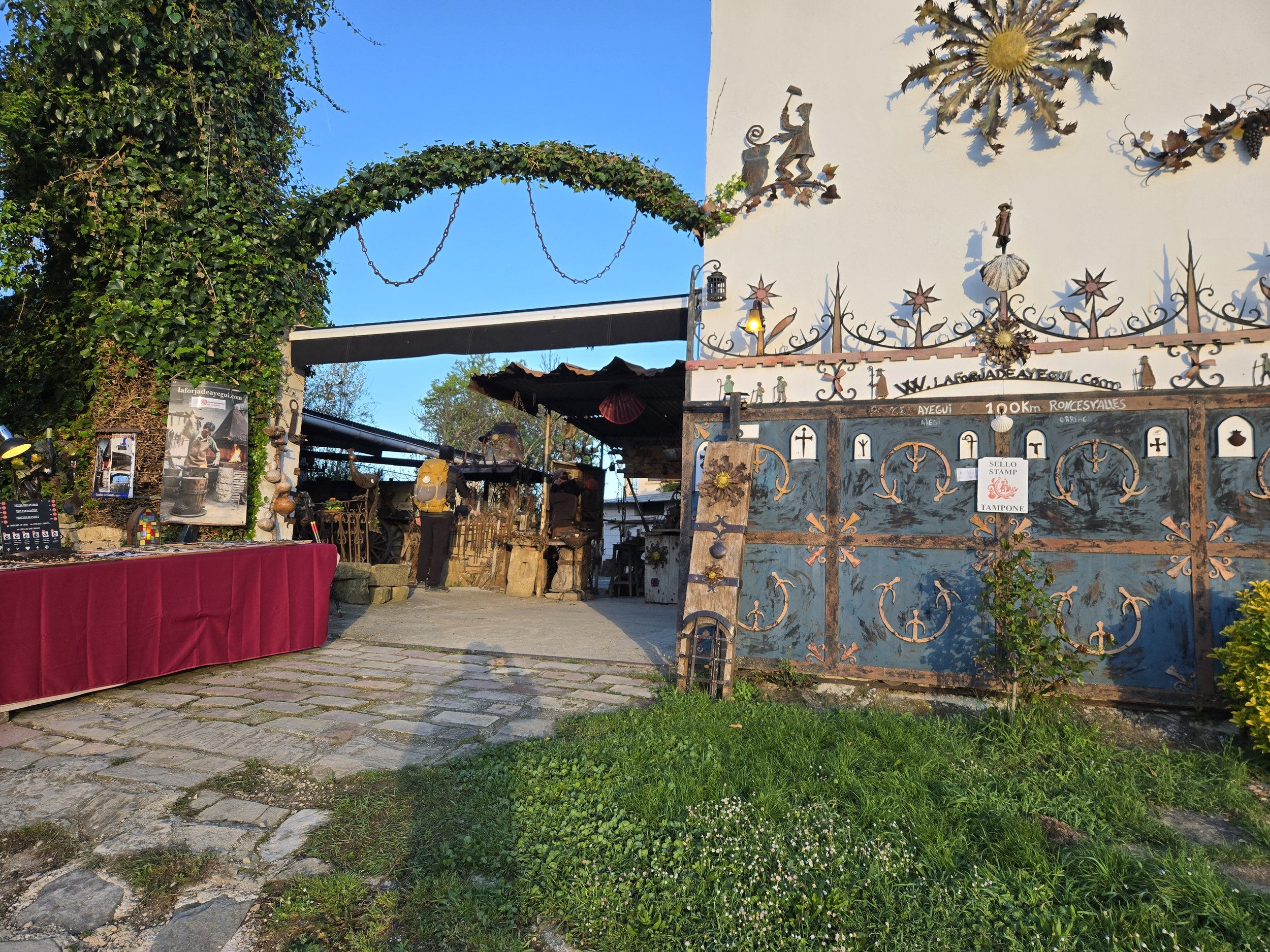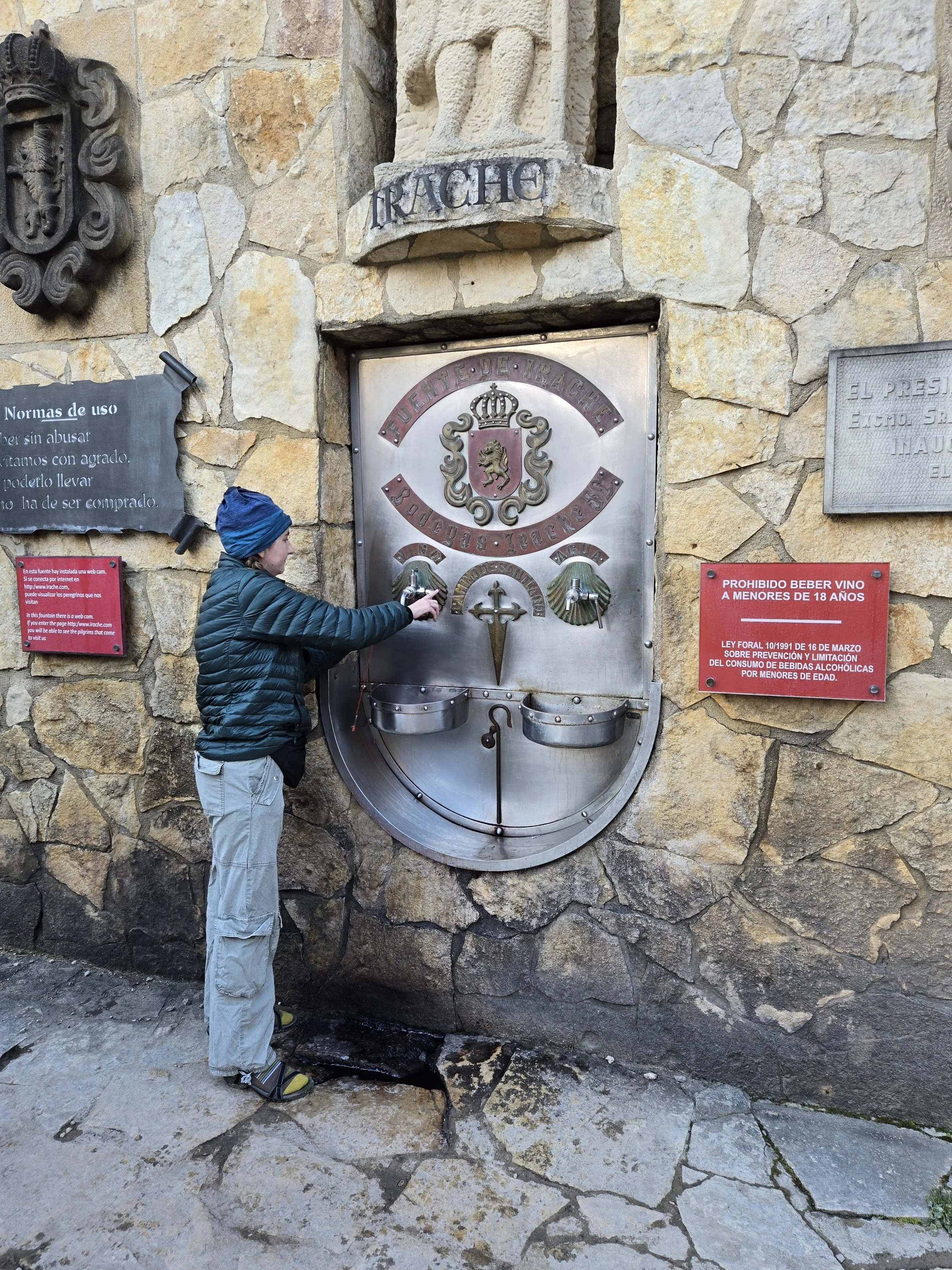Bought a banana and pastry in a convenience store at the edge of Estella and kept walking to the famous Irache wine fountain. Since it was the Thursday before Easter (a holiday in Spain apparently) the fountain had not been refilled so there were unfortunately only drips left. I still drank some wine from my shell and took some pictures though. Next door to the wine fountain was a blacksmith shop selling trinkets and I bought a shell necklace with the cross of St. James; it’s simple iron on a leather cord but I like the design and its light enough to carry.